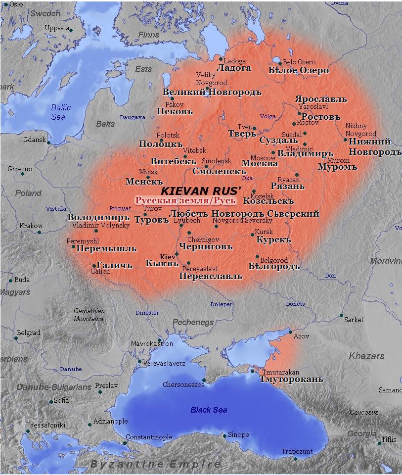 The map below shows the territory of Kievan Rus’ (Русскыя земля / Русь) during its peak, spanning the late 10th to early 12th centuries. The highlighted area marks the approximate extent of the medieval Rus’ state, including many principal cities such as Novgorod (Великий Новгородъ), Chernihiv (Черниговъ), Halych (Галичъ), Smolensk (Смоленскъ), and more. Kyiv (Кыѥвъ) was the capital, known as the "mother of Rus’ cities". Yaroslav the Wise (Ярославъ Мудрый) expanded the state and was renowned for law, diplomacy, and culture. The proximity to the Byzantine Empire shaped the art, religion, and trade of Kievan Rus’. Princes of Rus’ married into Byzantine royalty, and the Christianization of Rus’ in 988—marked by the adoption of Orthodox Christianity from Byzantium—linked Rus’ spiritually and culturally to the Eastern Roman Empire. This left a lasting religious legacy and profoundly shaped the identity of Rus’. Tmutarakan (Тмуторокань), shown in the southeast, was a distant principality controlling key trade routes between the Black Sea and the steppe. The map includes neighboring peoples such as the Pechenegs, Khazars, Poles, Magyars (Hungarians), Balts, Finns, and others who interacted with Rus’ through war, trade, and alliances. After the reign of Yaroslav the Wise, the Rus’ state gradually fragmented into rival principalities, paving the way for the rise of new regional powers.